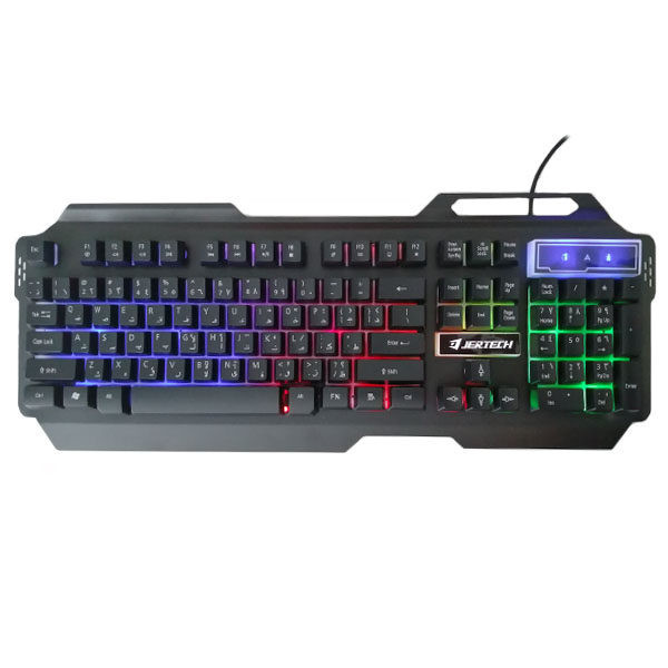 کیبورد مخصوص بازی جرتک K909 با رنگ های خاکستری، طلایی و مشکی مناسب برای انجام بازی های کامپیوتری می باشد. این کیبورد دارای 104 کلید بوده که حروف فارسی روی آن ها حک شده است. توسط اتصال سیمی و بوسیله پورت USB به کامپیوتر شما متصل می گردد. این محصول دارای بک لایت بوده و در هنگام اتصال به کامپیوتر نور پس زمینه آن در رنگ های مختلف روشن می شود و زیبایی بیشتری به کیبورد شما می دهد. این ویژگی در فضاهای تاریک بیشتر خود را نشان می دهد. فریم کیبورد مخصوص بازی جرتک مدل K909 فلزی است و دارای کلید های مکانیکی می باشد.